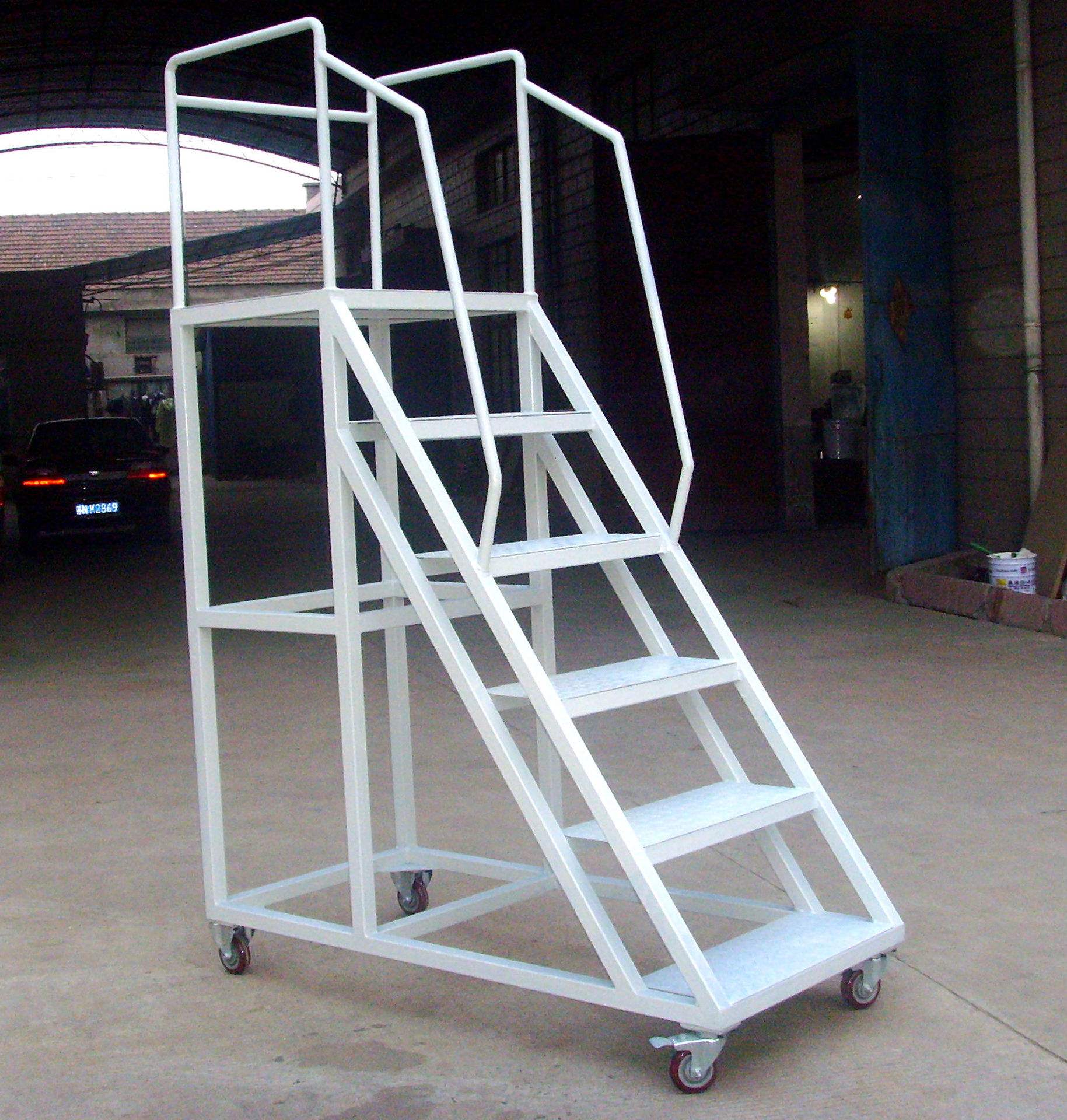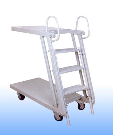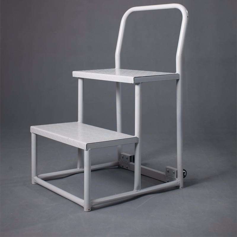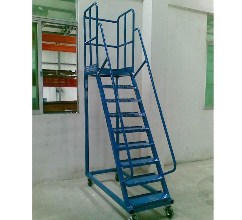 登高車的一面設有臺階(臺階旁邊有扶手)供使用者登上平臺,平臺另三面配有護欄保證作業者的安全。平臺作業面一般大小可容納1-2人站立、轉身、移動。使用者可在登高車的平臺上完成從貨架等高處堆取物品等動作。另外,登高車配有腳輪,可供使用者推拉轉向移動,方便快捷。其中有前腳輪上配備有輪剎,剎住后,登高車固定不可移動,使用者可安全放心的登高操作。